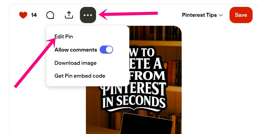 The steps is the same on desktop and mobile. You open the pin, you click the three dots, and then hit “Edit Pin” button.
